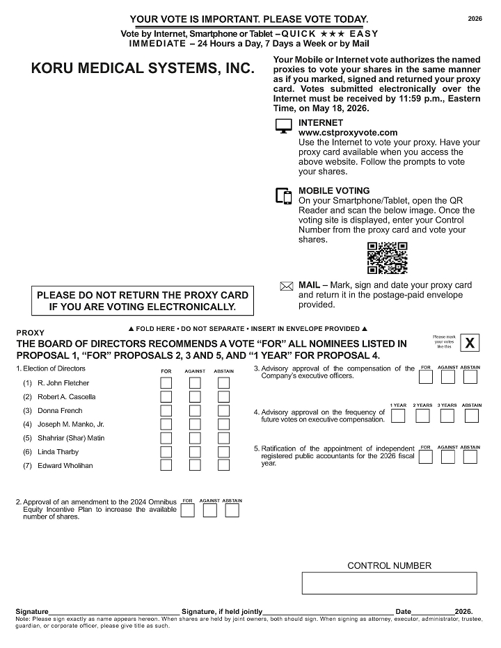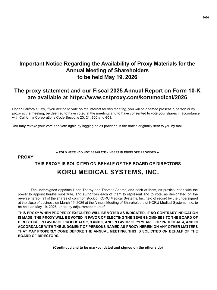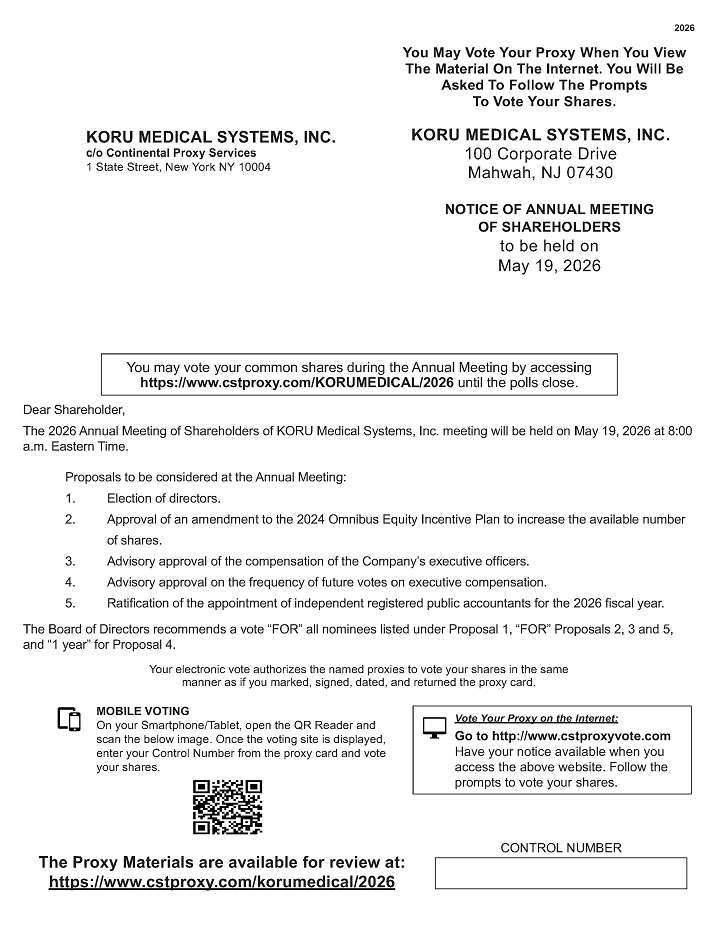 This Proxy Statement is furnished in connection with the solicitation of proxies by the Board of Directors of KORU Medical Systems, Inc. (the “Company” or “KORU Medical” and, as the context requires, “we”, “us” or “our”) to be used at the Company’s 2026 Annual Meeting of Shareholders to be held on May 19, 2026 at the time and place and for the purposes set forth in the accompanying Notice of Annual Meeting of Shareholders, and at any postponements or adjournments thereof. All proxies will be voted in accordance with the shareholders’ instructions, and if no choice is specified, the proxies will be voted in favor of the matters specified in the accompanying Notice of Annual Meeting of Shareholders and each of the director nominees specified herein. Any proxy may be revoked by a shareholder before its exercise by delivery of written revocation or a subsequently dated proxy to our Corporate Secretary by the close of business on May 18, 2026 or by voting again by internet or mobile device prior to or at the Annual Meeting before the polls close.