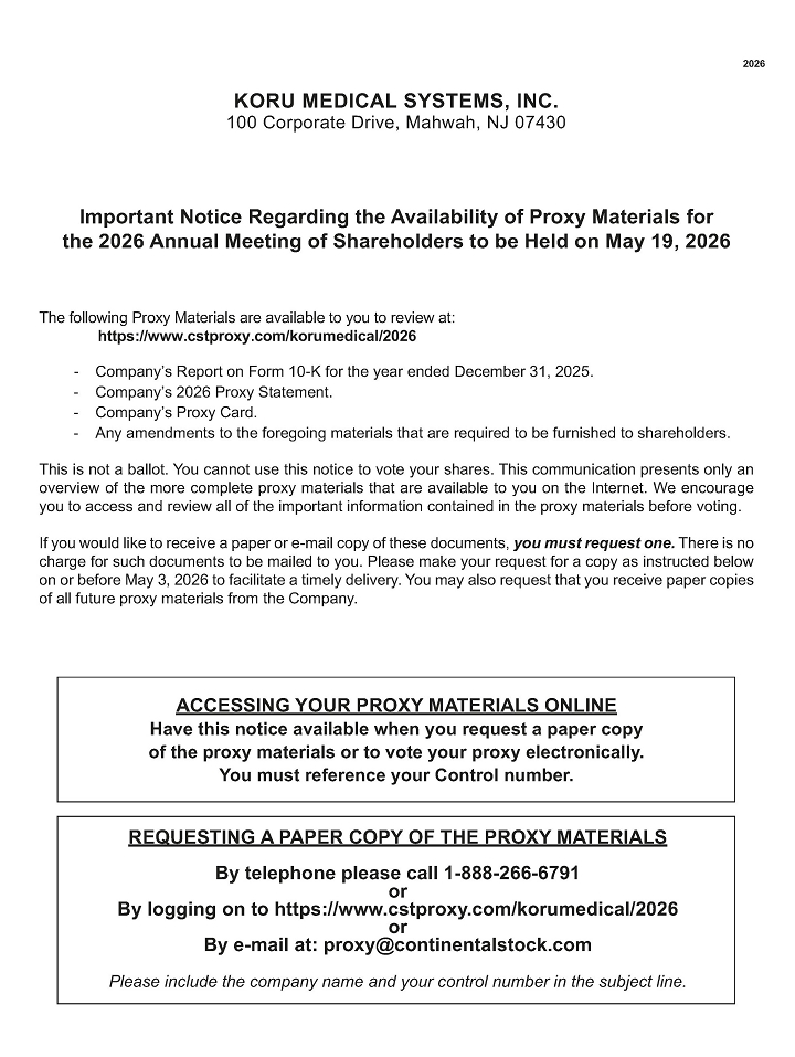 On or about April 9, 2026, we mailed to our shareholders of record and beneficial owners a Notice of Internet Availability of Proxy Statement (“Notice”) containing instructions on how to access this proxy statement and our 2025 Annual Report on Form 10-K via the Internet and how to vote online or by mobile device. This Proxy Statement, along with our Annual Report on Form 10-K for the fiscal year ended December 31, 2025 is available at http://www.cstproxy.com/korumedical/2026. As a result, you will not receive a paper copy of the proxy materials unless you request one. All shareholders are able to access the proxy materials on the website referred to in the Notice and in this proxy statement and to request to receive a set of the proxy materials by mail or electronically, in either case, free of charge. If you would like to receive a paper or electronic copy of our proxy materials, you should follow the instructions for requesting such materials in this proxy statement.